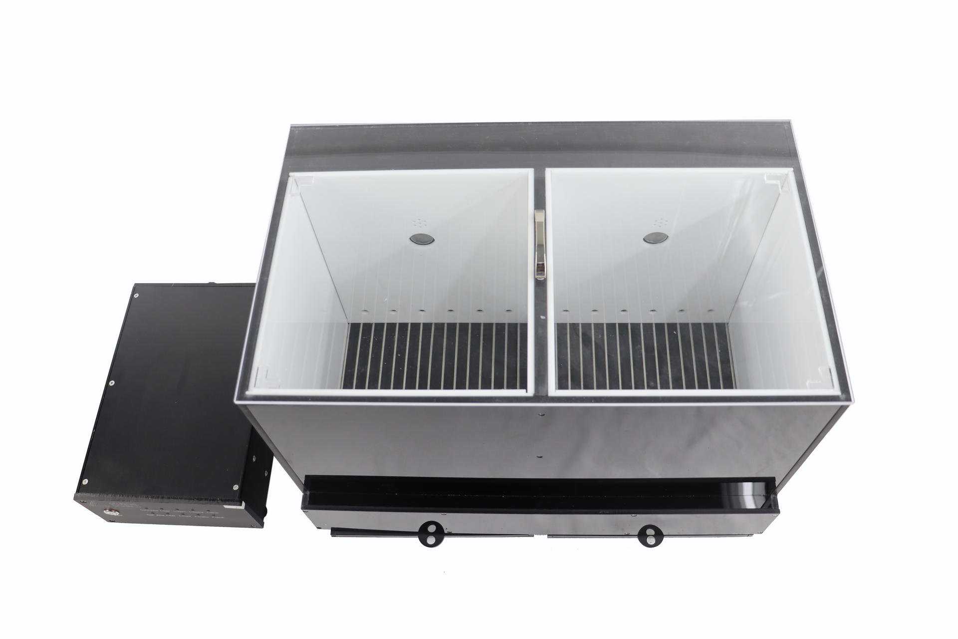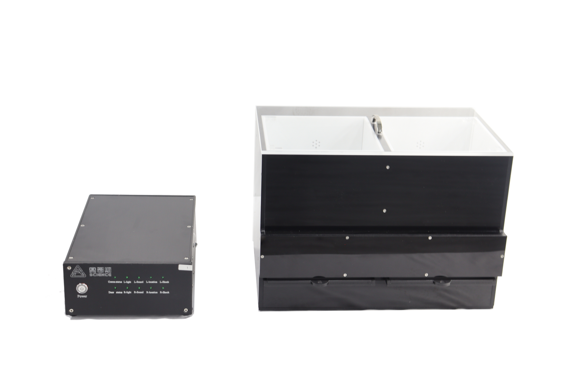 A top-loading door allows easy access inside the box. The chamber contains a sound generator and a visual stimulus (light) that functions separately for each compartment. Software be used through PC connection.